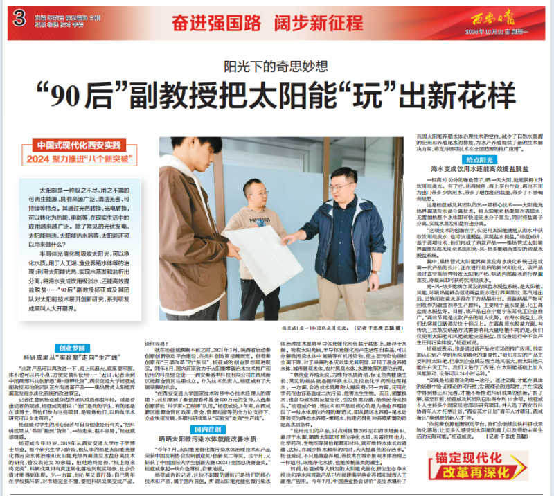 10月21日,《西安日報》以“陽光下的奇思妙想——‘90后’副教授把太陽能‘玩’出新花樣”為題刊發報道,詳細講述了西安交通大學副教授楊亞威在能源金貿區創業成長的故事。
