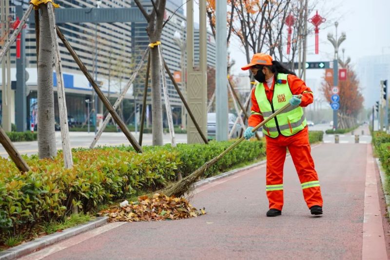 在園區市政道路,環衛工人身穿熒光綠工作服認真揮動著手中工具,清掃落葉、撿拾垃圾……頂著寒風為大家打掃出一條條干凈的街道。
