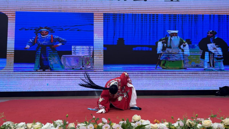 最令人期待的秦腔技巧展示及現場互動環節,更是將活動推向高潮。李胤彤帶來的“出手”表演,手中藥箱、馬鞭等道具翻飛自如,精準利落的動作引得臺下掌聲不斷;呂金霜、王洋、申一鳴三位演員合作的“吹火”絕技,一團團火焰在口中靈活變幻,奇幻的場景讓同學們發出陣陣驚呼,紛紛湊近舞臺近距離感受秦腔技藝的魅力。