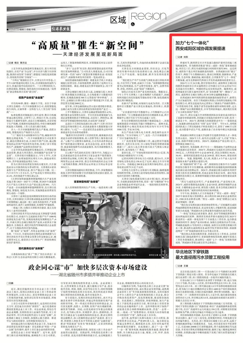 7月23日,《經(jīng)濟(jì)參考報(bào)》刊發(fā)《加力“七個(gè)一體化”西安咸陽區(qū)域協(xié)調(diào)發(fā)展提速》,聚焦西咸新區(qū)在推動(dòng)西安-咸陽“七個(gè)一體化”發(fā)展進(jìn)程中取得的新成效,展現(xiàn)兩地區(qū)域協(xié)調(diào)發(fā)展的加速態(tài)勢(shì)。