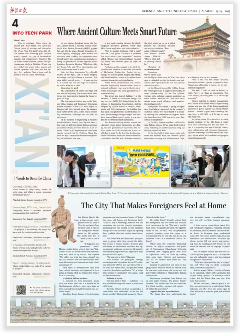 近日,科技日報英文版刊發主題報道,通過來自俄羅斯、巴基斯坦等國家五位外籍青年和創業者在西咸新區的實地探訪見聞,報道西安將深厚的文化底蘊與前沿科技創新融合,讓千年古城煥發生機活力的生動實踐。