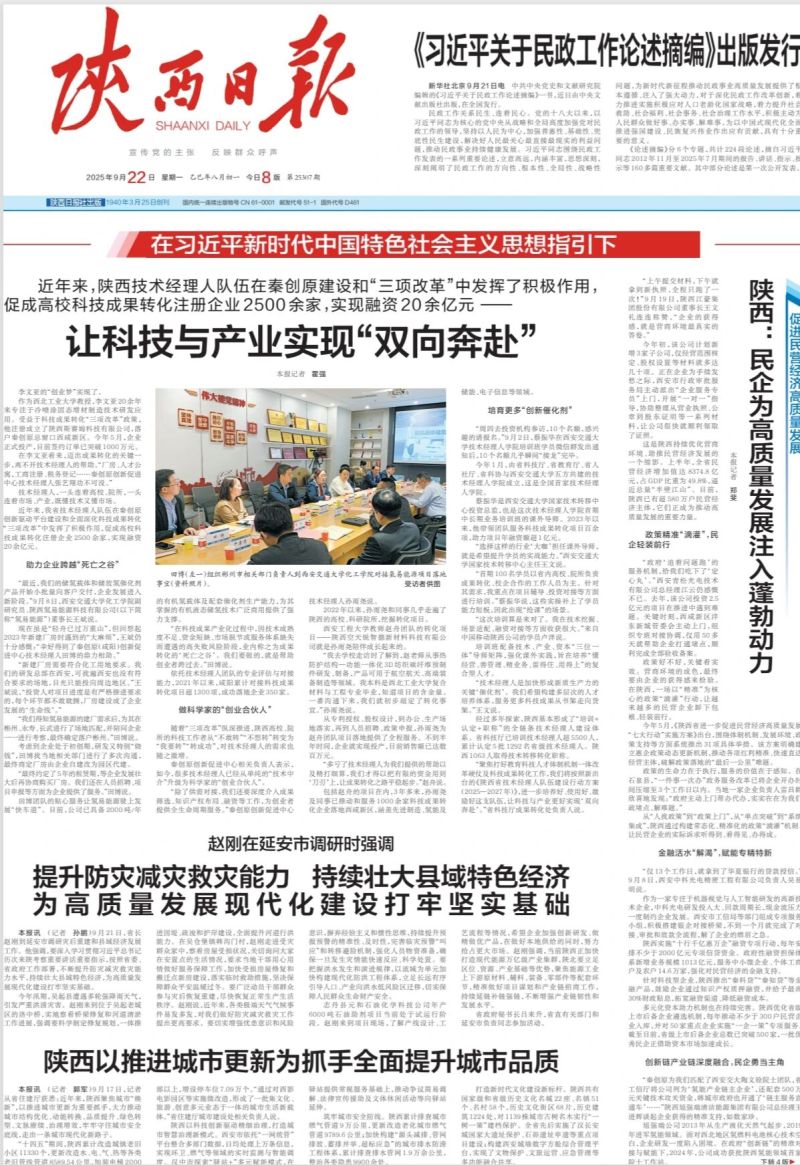 9月22日,陜西日?qǐng)?bào)頭版刊發(fā)報(bào)道《讓科技與產(chǎn)業(yè)實(shí)現(xiàn)“雙向奔赴”》,關(guān)注西咸新區(qū)作為秦創(chuàng)原創(chuàng)新驅(qū)動(dòng)平臺(tái)總窗口,以科技成果轉(zhuǎn)化“三項(xiàng)改革”為抓手,推動(dòng)科技與產(chǎn)業(yè)深度融合的生動(dòng)實(shí)踐。
