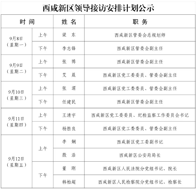 為進一步暢通信訪渠道,方便群眾及時就地反映訴求、解決問題,現將9月8日-9月12日西咸新區領導接訪安排計劃公示如下: