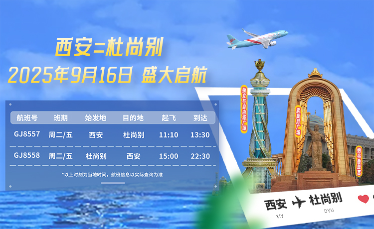 西安-杜尚別航線,往返航班號(hào)GJ8557/GJ8558,每周二、五執(zhí)飛。