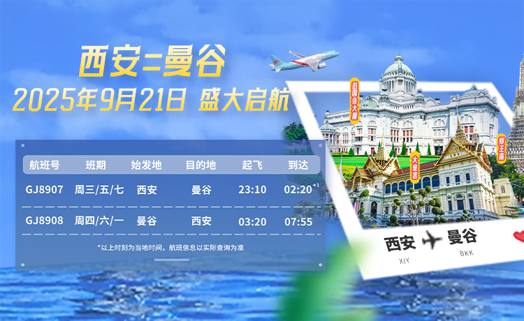 西安-曼谷航線,往返航班號(hào)GJ8907/GJ8908,每周三、五、日?qǐng)?zhí)飛。