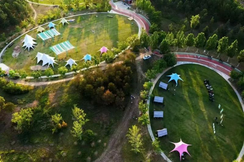 當(dāng)暮色四合,渭河披上星月紗衣。草坪茵茵,五彩天幕如花綻放,帳篷點(diǎn)綴其間,勾勒都市人向往的野趣圖景。