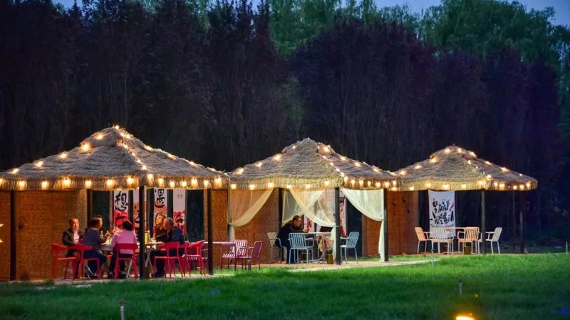 位于渭水河畔,2.4萬平方米的大草坪上,有天幕、帳篷、篝火。自助套餐里牛肉串、雞脆骨、魷魚須等33種葷素任選。夜晚時分,朋友們圍坐在篝火旁,唱歌、聊天、看星星,蟲鳴為伴、晚風作陪,嘴里的烤肉都變得更好吃了。