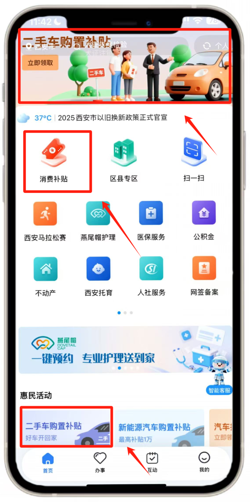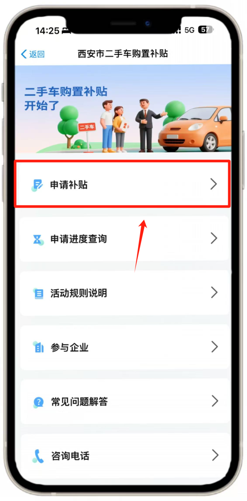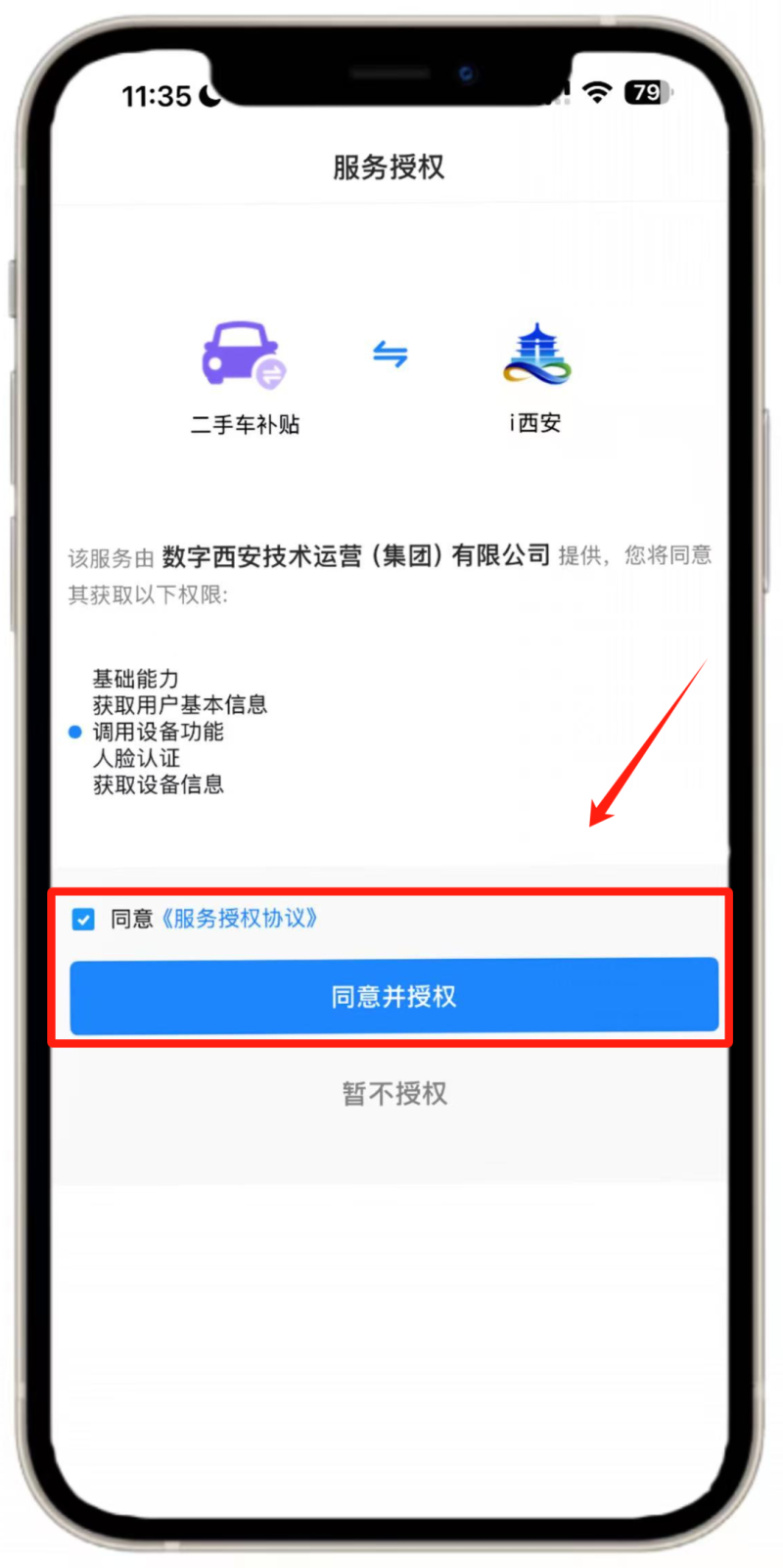 在【首頁】點擊輪播圖【二手車購置補貼】或下方圖標,點擊【同意并授權】進入活動頁面。