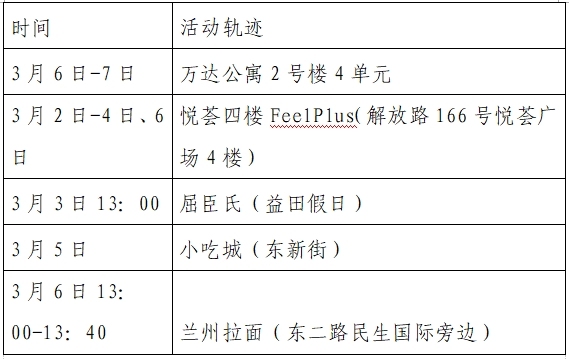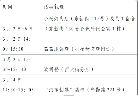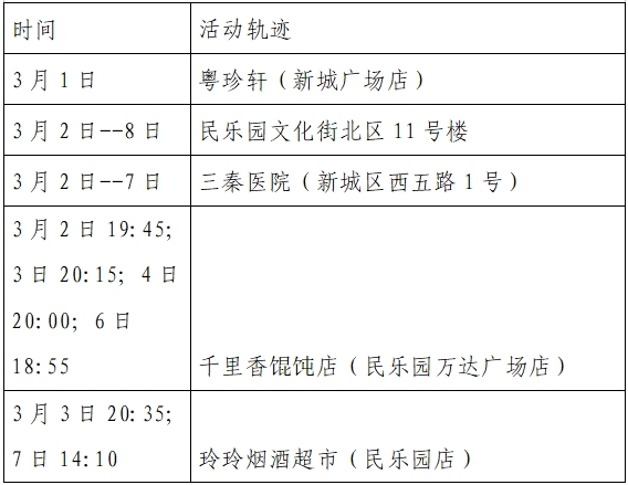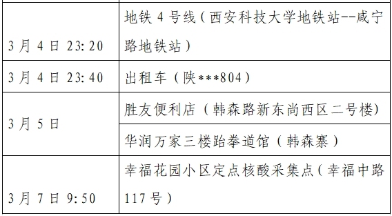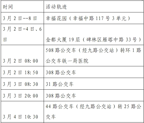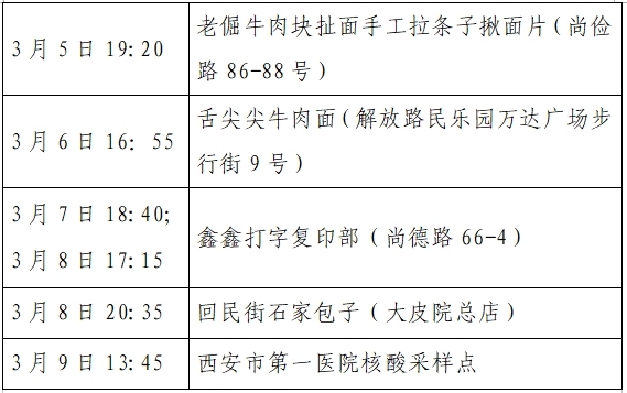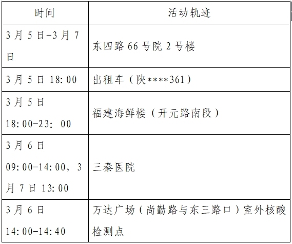 根據(jù)流調(diào)情況,3月10日0時-24時西安市新增8例本土確診病例,均為已發(fā)現(xiàn)病例的密切接觸者,為隔離管控人員,其公共場所活動軌跡公布如下: