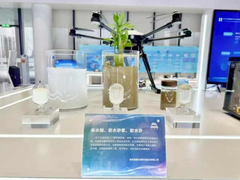 “改變沙漠水分流失的突破點(diǎn),關(guān)鍵就在這個(gè)杯子里,”成嘉磊手持透明實(shí)驗(yàn)杯,將幾克白色保水劑粉末輕撒入杯底,“這就是沙漠治理保水材料—保水劑,也是湄南高科生態(tài)修復(fù)系列的核心產(chǎn)品的初始狀態(tài),遇水后會(huì)變成半固體凝膠形態(tài),吸水倍率高達(dá)1500倍以上,”他一邊演示一邊介紹,1克材料可鎖住1公斤水分,使流沙轉(zhuǎn)變?yōu)橹参锷L(zhǎng)的“土壤銀行”。