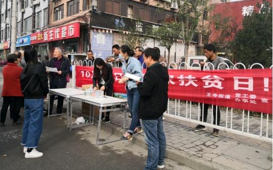 2019年是第6個國家扶貧日,這天同時也是第27個“國際消除貧困日”。為了引導我們身邊的人能夠關注貧困問題、關愛貧困人口、關心扶貧工作。10 月 17 日王寺街道辦在王寺十字人流量密集區舉辦扶貧日宣傳活動, 利用展板、橫幅、發放宣傳資料等形式向社會各界群眾宣傳扶貧工作。