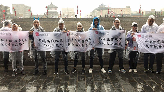 西咸新區近百名扶貧干部不畏風雨,如約而至,共同聚集在西安城墻安遠門下,踏上了西安城墻13.7公里的征程。