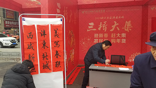 “勁松挺秀翠撒致富路,疏柳搖風綠遍小康家”、“大好河山施善政、小康歲月涌春潮”……一幅幅春聯寫滿了對美好生活的禮贊;《扶貧軼事》《夸陜西贊新城》《就戀這把土》等新區原創節目也贏得了一個又一個滿堂彩,尤其是老陜人最愛秦腔專場演出,匯集了西咸新區的眾多“名角兒”,將現場氛圍推向了高潮,參觀群眾紛紛表示,現場活動異彩紛呈,在大集上感受到了濃濃的年味兒!