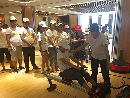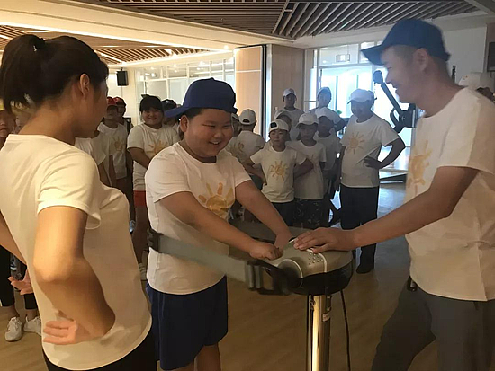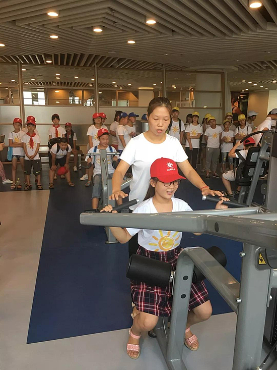在工作人員的帶領和講解下,孩子們依次參觀了游泳館、羽毛球場、乒乓球場、籃球場、健身房等,在專業健身教練的指導和協助下,親身體驗了動感單車、健身車、劃船機、橢圓機等健身器械。從小培養體育鍛煉的興趣和習慣,是孩子們成長為國家棟梁的基礎。