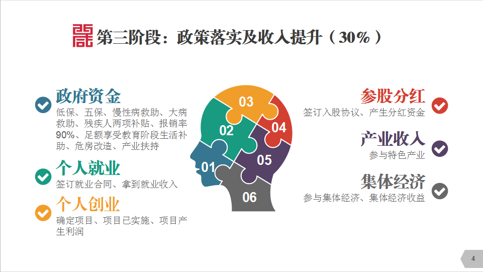 據悉,“階梯式”考核在考核脫貧成效時,對幫扶項目主次關系進行分類,各階段考核項目關系層層遞進,進一步明晰主要矛盾、次要矛盾,改變“眉毛胡子一把抓”的局面。如考核貧困戶脫貧成效時,將貧困戶脫貧過程分為四個階段。第一階段考核內容重點在幫助貧困戶解決吃、穿、住、醫、教五個基本生活方面進行明確,確保首先幫助貧困戶解決基本生活困難;第二階段考核內容重點在于提升戶容戶貌,在吃穿不愁基礎上讓廣大群眾切實感受到貧困戶生活質量的明顯提升;第三階段考核政策落實及收入提升,包括是否幫助貧困戶享受到政府幫扶資金,是否實現就業、創業,是否參與產業項目、分紅資金情況等;第四階段考察貧困戶精神面貌是否等到改善。西咸新區將對各階段進行逐級考核,同時根據每戶貧困戶具體情況對考核項目進行靈活調整,當貧困戶不具備指標實施條件時,不考核該項指標。