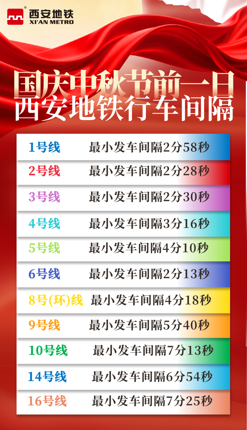 受通勤客流及節(jié)前外出客流的疊加影響,節(jié)前一日(9月30日),預(yù)計(jì)西安地鐵線網(wǎng)客流在晚高峰期間將持續(xù)處于高位,當(dāng)天線網(wǎng)主要線路從13:00起提前進(jìn)入晚高峰運(yùn)營模式,晚高峰運(yùn)營模式結(jié)束時(shí)間延長至22:30左右。同時(shí),西安地鐵進(jìn)一步提升節(jié)日期間(10月1日-10月8日)主要線路高峰及夜間運(yùn)力供給,全網(wǎng)上線列車數(shù)較日常增加26列,高峰小時(shí)運(yùn)力最大提升36%,進(jìn)一步滿足節(jié)日期間市民乘客的出行需求。