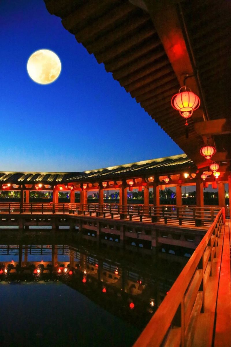 關雎廣場、鹿鳴食街周邊:錯落的仿古建筑可作前景,以屋檐、角樓為襯,讓月亮懸于建筑輪廓之上,輕松拍出古風意境大片。