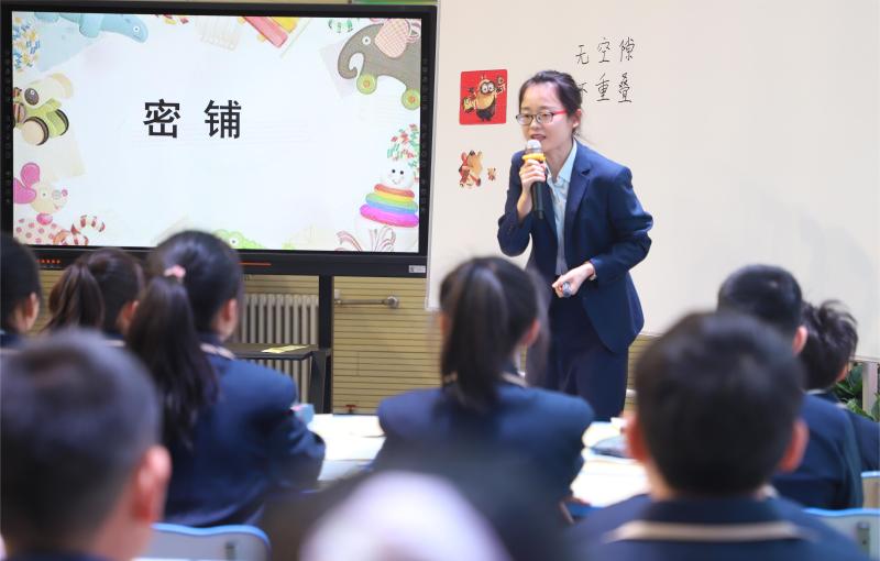 灃東第二小學胡陽陽老師執教四年級下冊數學《密鋪》一課,由學生熟悉的拼圖導入,初步感知密鋪特點。創設真實問題情境,解決學校圖書室鋪磚問題,從而探究圖形密鋪的奧秘,環節設置層層遞進,注重學科之間的整合。