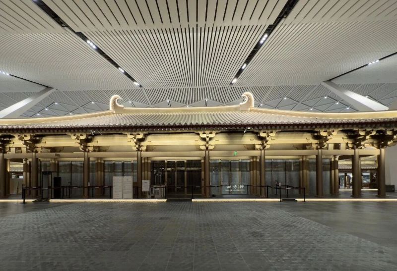從T5航站樓任意一處進入候機大廳,首先映入眼簾的,就是輕質鋼結構和金屬鋁板建造而成的仿唐式建筑群,既有廡殿頂、歇山頂等各種古建筑屋面形制,又有斗拱、飛檐等各類裝飾構件。唐代建筑的空間意境被解構為現代功能載體。