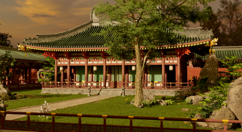 在這個虛擬現實里,唐長安城被11條縱向道路和14條橫向道路有序劃分成市、坊、宮城、皇城等“功能區”。當觀眾于飛躍中從高空鳥瞰,長安城縱橫交錯的棋盤式街道在眼前恢弘鋪展,皇城、宮城與市坊的森嚴秩序清晰可辨;飛行其間,唐代建筑的飛檐斗拱、朱門回廊皆依史料還原;鴻臚寺官署的莊重形制——從殿宇的規制到梁柱的紋飾,從庭院的布局到門窗的樣式,每一處細節都傳遞著古代官署的禮儀與威嚴。