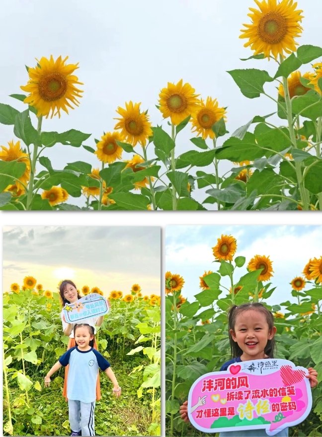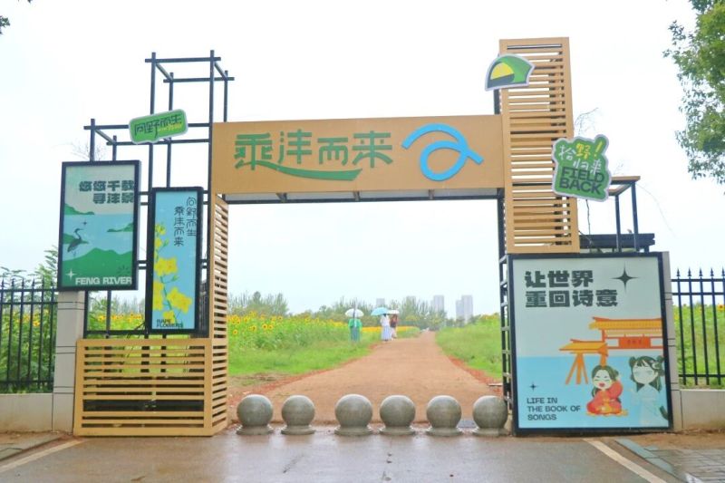 站在花田邊望去,金黃的花瓣與遠處的詩經里古風建筑相映成趣,微風拂過,花浪翻滾間還能聽見灃河的流水聲,仿佛是從詩詞里走出來的風景。