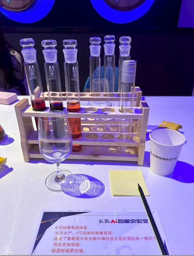 熱衷于動手體驗(yàn)的游客,千萬別錯(cuò)過“智釀實(shí)驗(yàn)室”。這里提供干紅、甜紅與桃紅三款基酒,游客可化身釀酒師,親手調(diào)配專屬自己的葡萄酒口味。調(diào)配完成后,還能免費(fèi)帶走試管酒,儀式感直接拉滿。