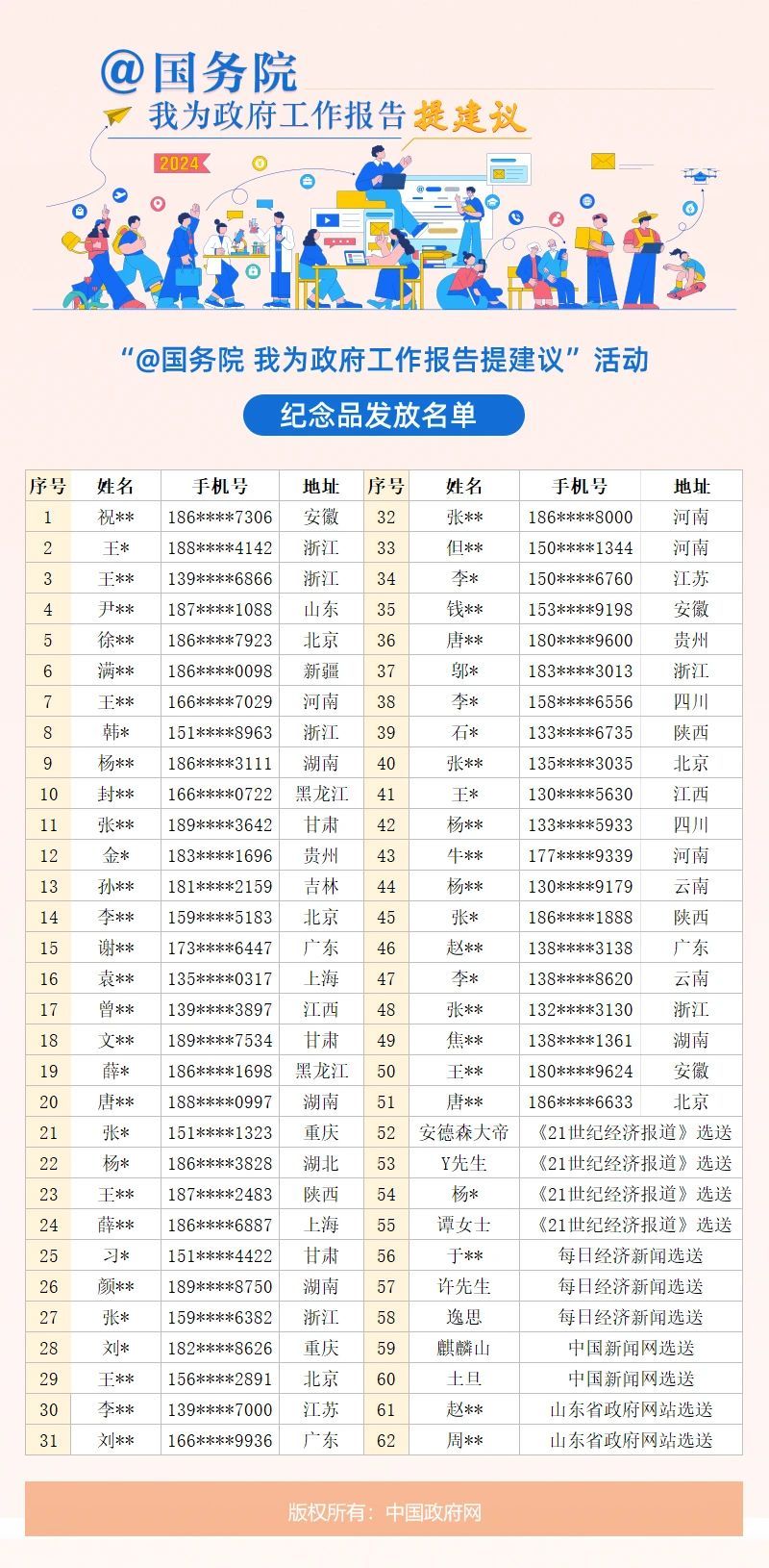 截至目前,活動收到建言量已突破50萬條,我們從中選取了62位所提建言較有典型性的網(wǎng)民,送出中國政府網(wǎng)2024年效率手冊一本、中南海郵局明信片一張??靵砜纯从心銌??