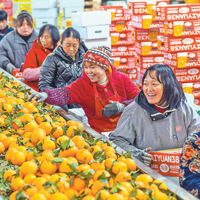 四川省眉山市彭山區黃豐鎮一家果業公司車間內,村民正在分揀耙耙柑。