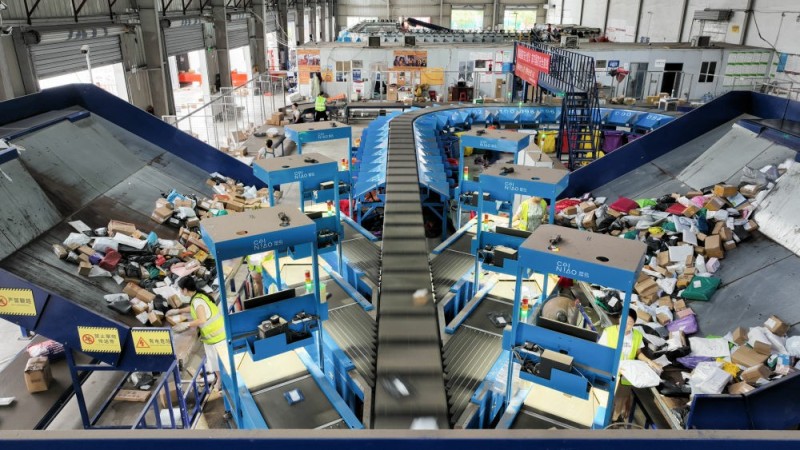 ?6月18日,在重慶市秀山土家族苗族自治縣武陵現代物流園區快遞分撥中心,工作人員在智能快遞分揀流水線上作業(無人機照片)。新華社發(胡程攝)