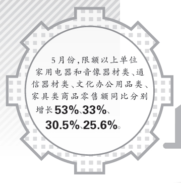 除電動自行車外,手機、平板電腦等數碼產品同樣銷售火熱。5月份,限額以上單位家用電器和音像器材類、通信器材類、文化辦公用品類、家具類商品零售額同比分別增長53%、33%、30.5%、25.6%,合計拉動社會消費品零售總額增長1.9個百分點,比上月提高0.5個百分點。