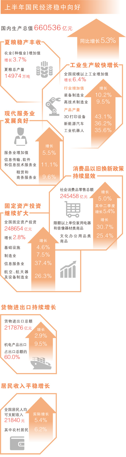 國內(nèi)生產(chǎn)總值(GDP)增長穩(wěn)中有升。初步核算,上半年GDP為660536億元,同比增長5.3%,比去年同期和去年全年均提升0.3個百分點。