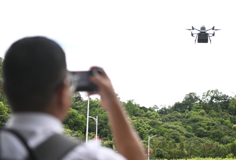2025年6月26日,參觀者在聯合飛機集團深圳基地拍攝飛行中的物流無人機。新華社記者 鄧華 攝