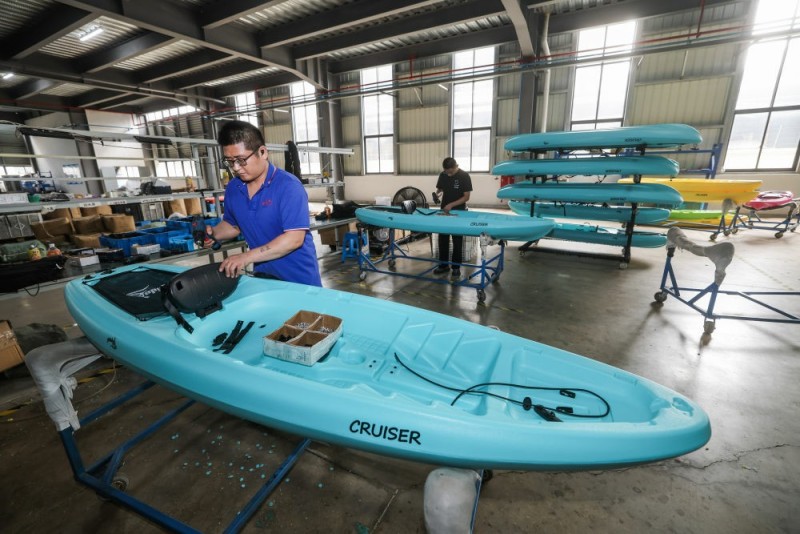 ?6月25日,在位于慈溪市的浙江酷爾智能科技有限公司的車間內(nèi),工人在加工出口的皮劃艇。新華社記者 徐昱 攝