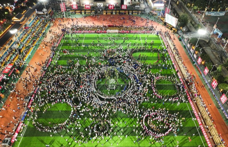 8月23日,人們在貴州“村超”球場跳苗族蘆笙舞(無人機照片)。2025年首屆“村超”全國賽總決賽在貴州榕江縣“村超”球場舉行。廣東肇慶金利誠峻足球隊2:0戰勝廣東和平商會足球隊,斬獲全國總冠軍。賽事期間同時舉辦豐富多彩的民族歌舞展演、無人機表演、大型煙花秀,吸引數萬觀眾現場觀賽。新華社記者 楊文斌 攝