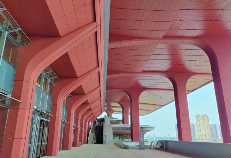南立面主導墻面采用西安特有赤陶板,每塊經1280℃高溫淬煉出秦俑般的古樸質感,方正輪廓與拱形結構暗合“天圓地方”哲學,既延續周秦高臺建筑的雄渾氣韻,又以現代力學實現結構穩固。
