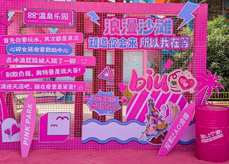 芭比粉的細沙柔軟細膩,搭配粉色花墻、彩色遮陽傘和可愛泳圈,整個區域像掉進童話書里的“粉色王國”。穿淺色泳衣站在其中,隨手拍都是驚艷朋友圈的大片,輕松擁有“專屬粉色海景”。