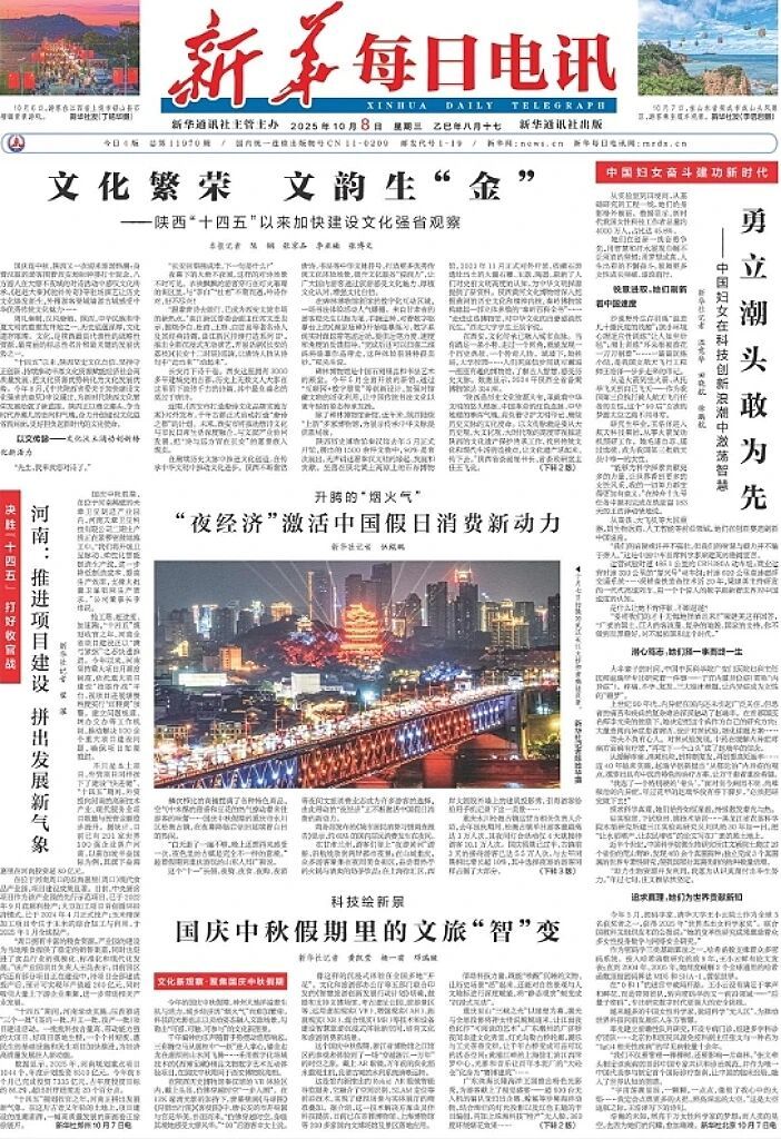 10月8日,《新華每日電訊》頭版頭條刊發(fā)《文化繁榮 文韻生“金”——陜西“十四五”以來加快建設(shè)文化強(qiáng)省觀察》,其中以陜歷博秦漢館、《赳赳大秦》演藝等為例,報(bào)道陜西持續(xù)推動(dòng)豐厚文化資源賦能經(jīng)濟(jì)社會(huì)高質(zhì)量發(fā)展的生動(dòng)實(shí)踐。