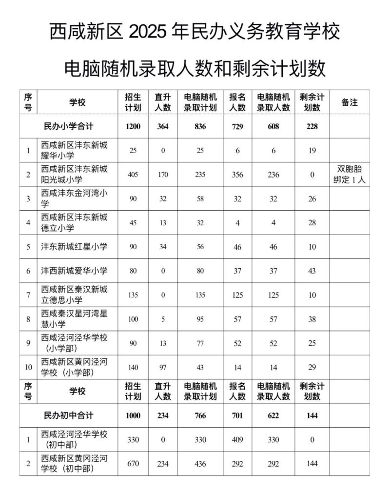 西咸新區(qū)2025年民辦義務(wù)教育學(xué)校電腦隨機錄取人數(shù)和剩余計劃數(shù)