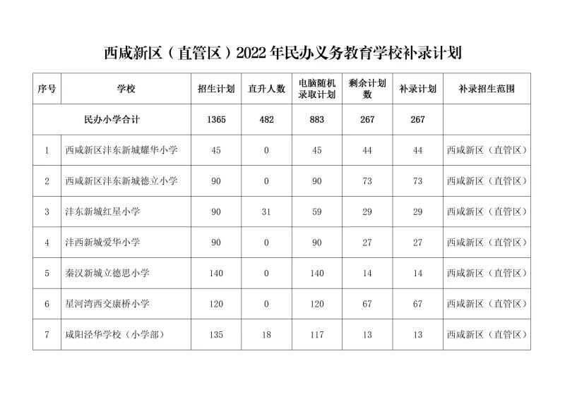 西咸新區(qū)(直管區(qū))2022年民辦義務(wù)教育學(xué)校補(bǔ)錄計(jì)劃